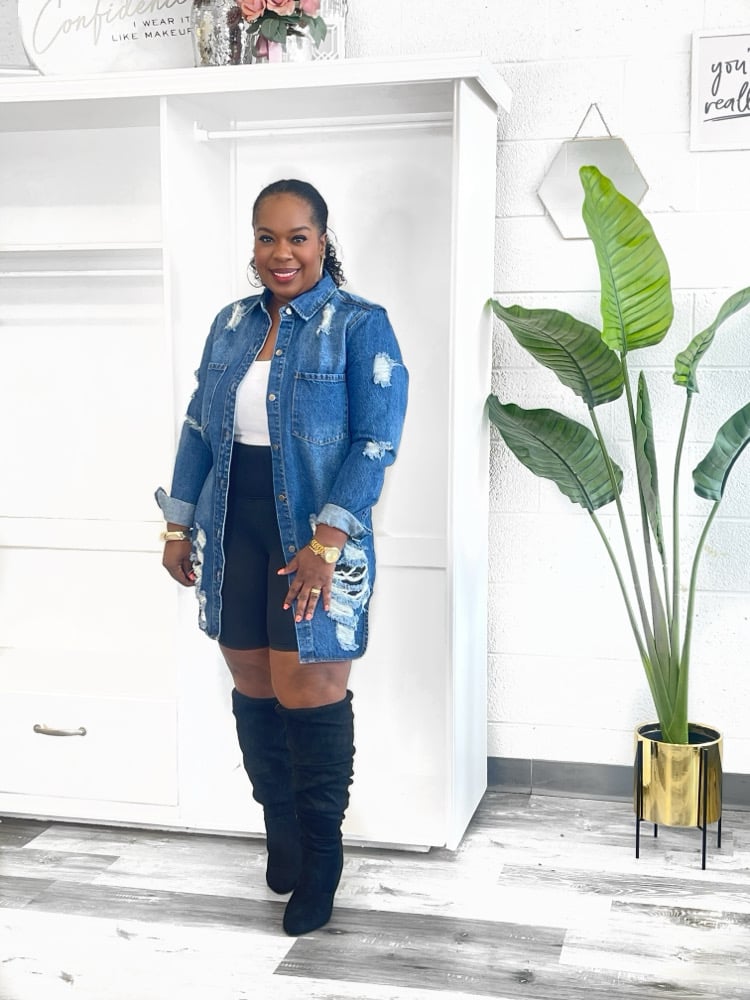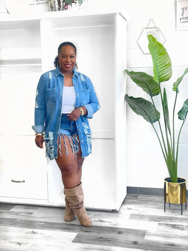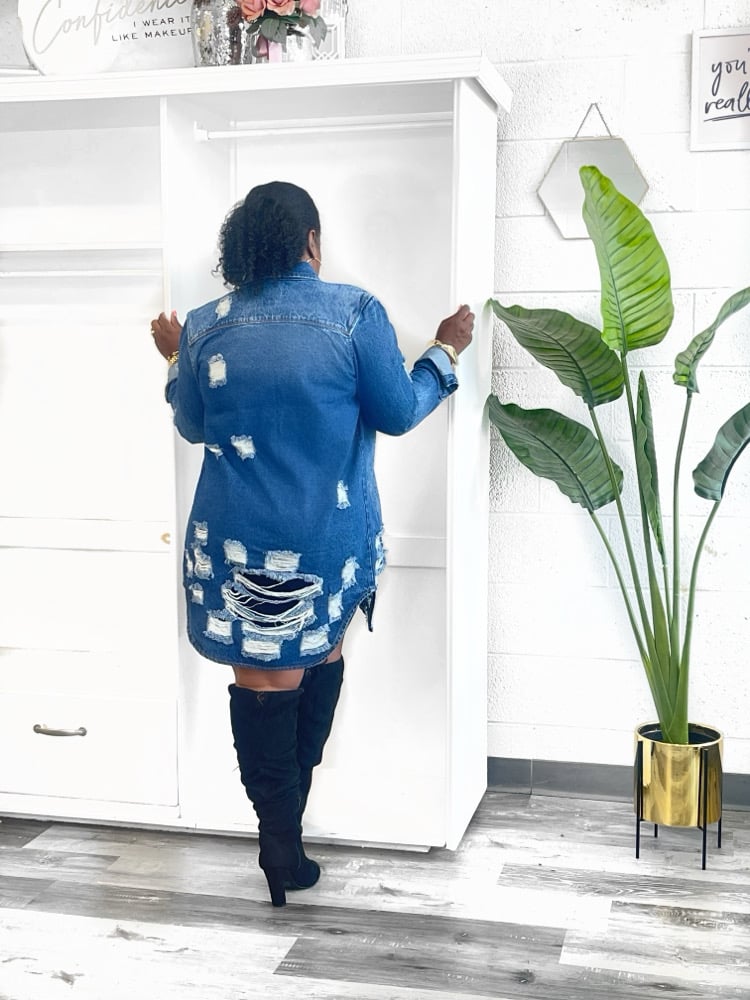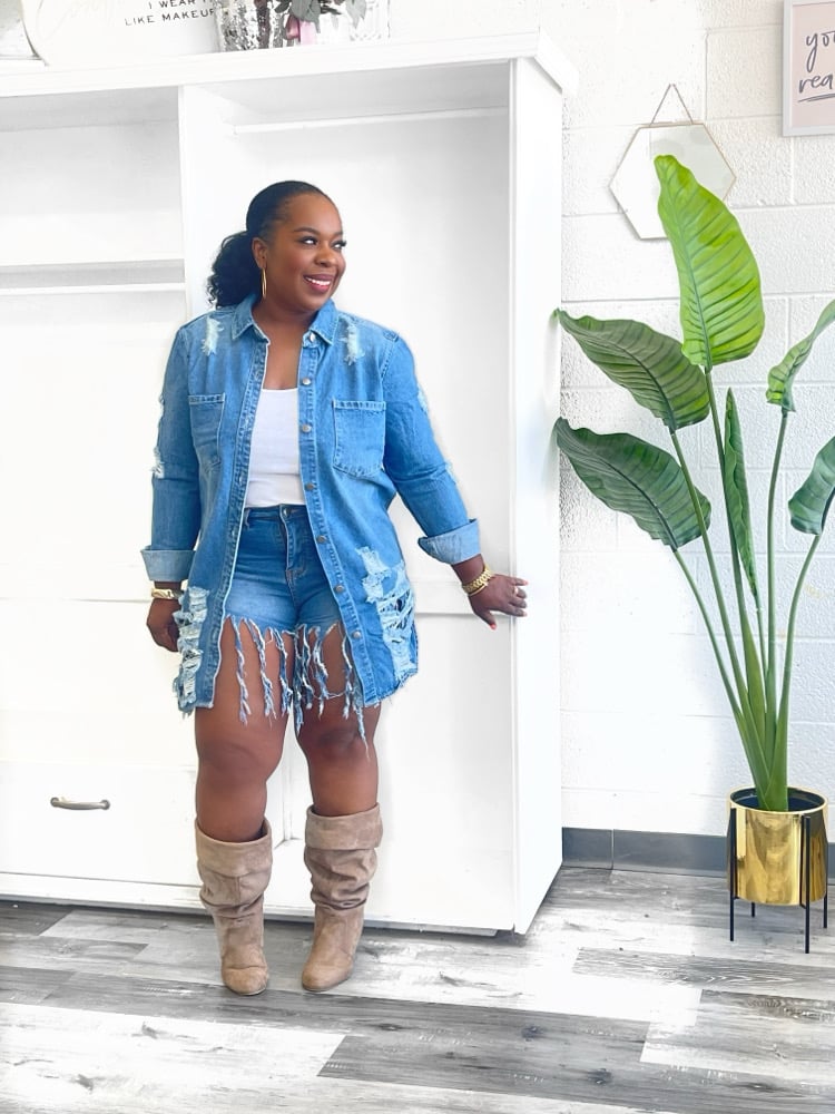 Meet Desiree, your new denim shacket that adds a playful edge to any outfit. Featuring a button-front closure and distressed trims for a cool, lived-in vibe, this piece effortlessly blends the best of a shirt and jacket. Perfect for layering or rocking with denim shorts, jeans, or your favorite leggings.