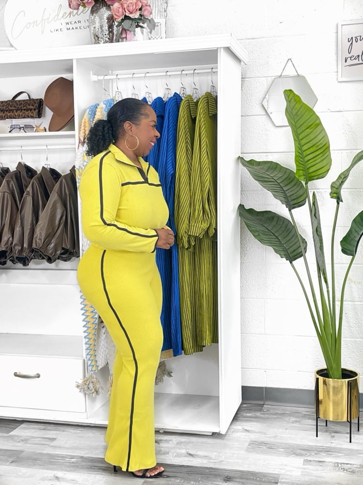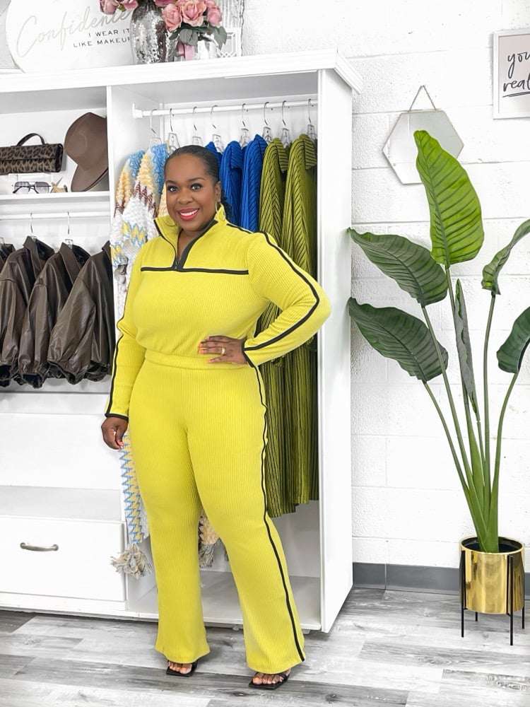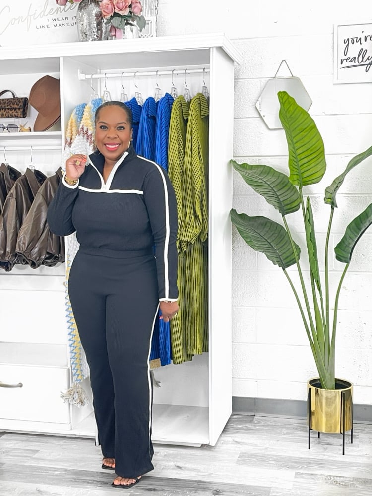 Get into Raven! A cozy two-piece set that's all about comfort meets style. The long sleeve top features a mock neck, half-zip design, and eye-catching stripe detailing with rib 4x4 fleece for that perfect soft feel. Pair it with the matching wide-leg pants, complete with elastic waistband and coordinating side stripes for a put-together look that feels like lounging. Effortless, playful, and ready for anything from coffee runs to casual hangouts. Dress her up or down!